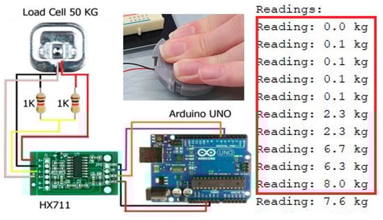 Figure 5 shows an implementation of a weight-monitoring module with a single load-cell along with its measured results obtained by pressing a single load-cell with a human hand, where it is clearly seen that the variation of weight is recorded.