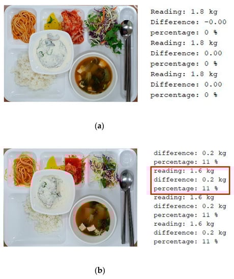 Meal weight measurements with no calibration factor: (a) initial meal and (b) after the meal time.