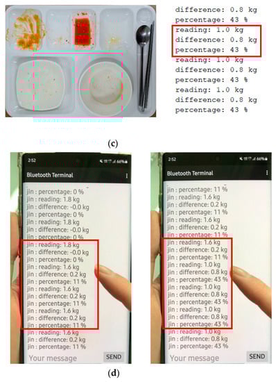 Meal-weight measurements with a corrected calibration factor: (a) initial meal, (b) meal in the middle, (c) after the meal time, and (d) wireless transfer via Bluetooth.
