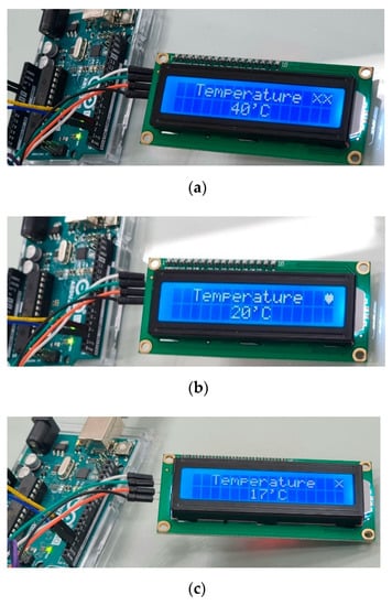 In order to demonstrate an example of temperature measurements, we exploited a non-contact optical sensor and an Arduino NANO board with an LCD display. Here, the reference temperature was set to 30 °C. Figure 7 demonstrates the measured results of the meal temperature-monitoring system for three different temperatures. First, Figure 7a shows the temperature of 40 °C, which is high above the reference. Therefore, it shows a form of alarm (XX mark in this work) on an LCD screen for hot temperature. Second, Figure 7b demonstrates the mild temperature of 20 °C, with no alarm turned on yet, rather showing a heart sign in this work. Third, when a meal temperature below 20 °C is detected, the monitoring system sends an alarm signal to nurses so that the cold meal can be replaced with a hot one if necessary. Third, Figure 7c depicts the temperature of 17 °C, which is below the other reference of 20 °C. Then, an X mark is displayed on the LCD screen as a token of alarm. The size of an LCD display utilized in this work can be replaced with a much larger one for senile dementia patients in order for them to recognize the alarm vividly.