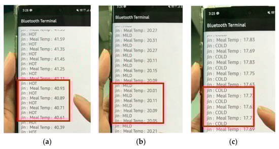 Figure 8 presents the wireless transfer of the temperature information onto the mobile phone via a Bluetooth network so that nurses can easily be alerted to the need for replacing a cold meal with a hot one. Furthermore, families can see the state of food temperature served in elder-care hospitals or nursing homes in real time.