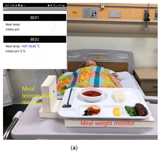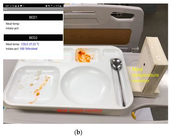 The aforementioned two types of monitoring systems were combined and placed on a clinical bed in a simulation ward for more practical testing, as shown in Figure 9. This combined monitor system concurrently measures the mean temperature and the amount of meal intake in real time. Here, we set the reference temperature to 35 °C, below which senile dementia patients might detect soup as cold and demand it to be replaced. Figure 9a is the case of before-the-meal intake, demonstrating on a smart phone display that the hot meal temperature is measured to be 46.85 °C, while the meal weight variation is 0%. Figure 9b is the case of after the meal, exhibiting the cold temperature of the empty tray and confirming 100% meal intake of the patient.