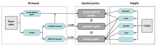 In the process of urban regional development, the essence of spatial justice is to deal with the distribution of specific benefit of different groups in the process of resource allocation, and research on the supply–demand relationship of UERS is a typical problem of spatial justice research. The spatial justice is not absolute equity in the ideal sense but a kind of equity under the dynamic social relationship with historical development, which can be divided into three main stages: geographical parity, spatial equity, and social equity (Figure 1). The first stage of “geographical parity” is to solve the problem of the availability of UERSs in the region and to ensure that the amount of resource services per capita in different spatial units is basically equal [7,8,9]. The second stage of “spatial equity” not only pays attention to equal distribution of the UERS but also begins to emphasize the rationality of spatial layout of it. Therefore, the basic needs of people are paid attention, and scholars begin to explore the relationship between the allocation area of UERS and its corresponding service benefits [5,10,11]. In large cities with better development, a large-scale renovation is completed gradually and the development space inside the city is seriously limited. Cities gradually enter this stage of fine governance, which makes scholars and planners gradually pay attention to people’s democratic rights. Since then, the research on spatial justice has entered the third stage of “social equity”. This stage emphasizes that the abilities and needs of various groups are different, and it is necessary to ensure equal access to public service resources in different spaces and different socioeconomic groups and to advocate that services should be inclined toward specific vulnerable groups [12,13,14]. The case area of this study is Wuhan, a large city with a high level of development, so we study its supply–demand relationship in depth based on the social equity dimension.