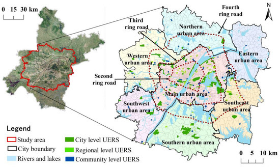 UERS refers to all areas or places within the urban and suburban areas that have ecosystem service functions and can meet the daily outdoor recreation needs of residents, specifically including formal or informal space units with ecological properties and public service properties composed of natural or artificial landscapes, such as urban parks, botanical gardens, forest parks, wetland parks, leisure plazas, country parks, waterfront spaces, etc. [39].