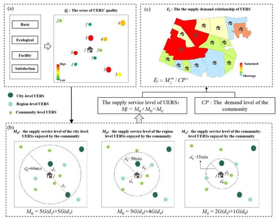 Based on the results of supply and demand levels enjoyed by different communities, the supply–demand index Ej of each community is calculated using the following formula to analyze the balance between supply and demand for UERS (Figure 3c):