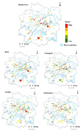 In summary, the quality of UERS is unevenly distributed in the urban development area of Wuhan based on all four dimensions. It can be seen that the first-class and second-class ecological recreation spaces with high-quality scores in the urban development area of Wuhan are mainly distributed in the main urban area and new towns in the southwest and south, showing the characteristics of distribution near the lake and along the river. As the landscape of rivers and lakes not only increases the ornamental value of UERS but also improves its ecological function to a certain extent, the ecological environment and recreation satisfaction of UERS along rivers and lakes are relatively high. The UERS with a low-quality score has a small scale and insufficient facilities and landscape, which is scattered in various urban areas.