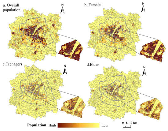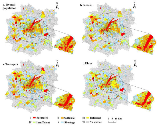 Social spatial justice emphasizes the need to guarantee the equality of all residents’ enjoyment of spatial rights and interests, focuses on the differences in the abilities and needs of social groups, and advocates that public services should be inclined toward vulnerable groups. Therefore, we analyzed the demand characteristics of all residents and three special groups: female, teenagers, and people who are older in the urban development area of Wuhan (Figure 6).