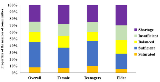To sum up, there are obvious differences in the supply–demand matching relationship of UERS among diversified social groups, but the overall equity level is low and the supply and demand of UERS in most communities are in a mismatched state. Among them, except for communities without services, teenagers are in an unbalanced state of supply surplus, while women and people who are older are in an unbalanced state of supply deficit.