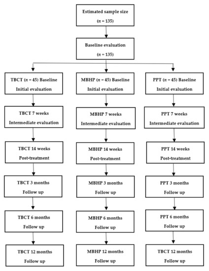 This study project is a randomized single-blind control trial with three parallel groups. After sample selection, patients with PTSD that developed or recurred as a consequence of the COVID-19 pandemic will be randomly assigned to TBCT, MBHP or PPT, with all therapies delivered online. Figure 1 shows the flowchart of the study. The duration of treatment will be 14 to 17 weeks, with a follow-up of 3, 6 and 12 months. The online psychotherapies will be carried out individually and weekly, totaling 14 one-hour sessions. Outcome measures will take place before session 1, session 7 and session 14, as well as at 3, 6 and 12 months. This study protocol was written following the standard protocol items, recommendations for interventional trials (SPIRIT) [46], has been registered on Clinicaltrials.gov (NCT04852770) and approved by the Ethics Committee of Maternidade Climério de Oliveira at Federal University of Bahia, Brazil. This study was funded by the National Council for Scientific and Technological Development (CNPq).