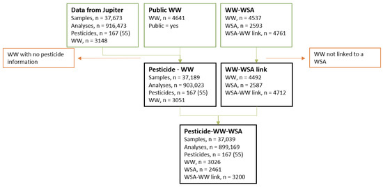 Pesticide data were linked to waterworks using a waterworks ID. Waterworks with missing data on geographic coordinates or address were excluded from the study. Next, the pesticide data were linked to WSAs via spatial joints between waterworks and WSAs. Waterworks not linked to a WSA were excluded. The process is illustrated in Figure 1.