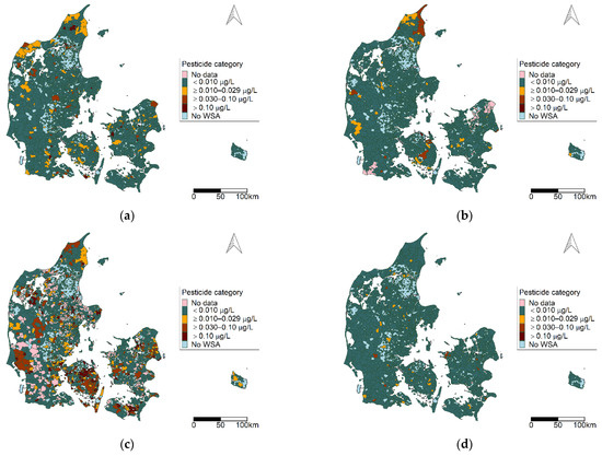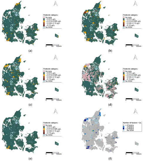 Geographic distribution of pesticide categories at the water supply area (WSA) level for selected pesticide groups for the period 2002–2018: (a) benzothiazinones; (b) benzonitriles; (c) organophosphates; (d) phenoxy herbicides; (e) triazines; (f) triazinones. Map contains data from the Danish Agency for Data Supply and Efficiency, municipality borders, 2019.
