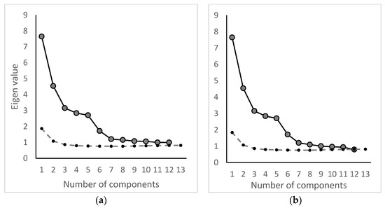 (a) Initial scree plot, where six factor components were retained. (b) Final scree plot, where five factor components were retained. The dotted line represents Horn’s parallel analysis.