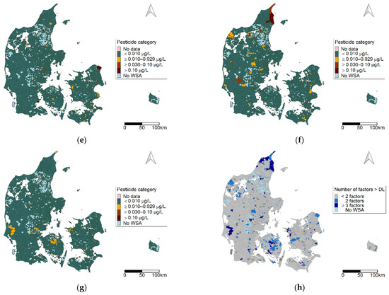 From Figure 3a–f, one can observe that each pesticide group has a unique distribution pattern, and that all parts of Denmark are represented. Benzonotriles (group b) were the most prevalent group detected of the groups presented. In addition, we observed areas where multiple pesticide groups were detected, which included the northern and north-western part of Jutland, the southwestern and central part of Jutland, and eastern parts of Zealand and Bornholm.