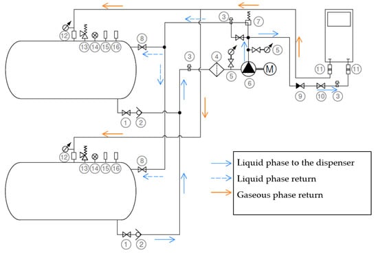 Flow diagram of liquid gas filling system, where (1) liquid phase intake ball valve, (2) overflow valve, (3) hydrostatic valve, (4) liquefied gas filter, (5) dial pressure gauge, (6) liquefied gas pump, (7) by-pass overflow valve, (8) liquid phase intake valve, (9) non-return valve, (10) ball valve, (11) emergency release coupling, (12) gaseous phase intake valve with pressure gauge, (13) safety valve, (14) tank filling indicator, (15) valve of tank filling by tank truck, (16) storage tank emergency drain valve.