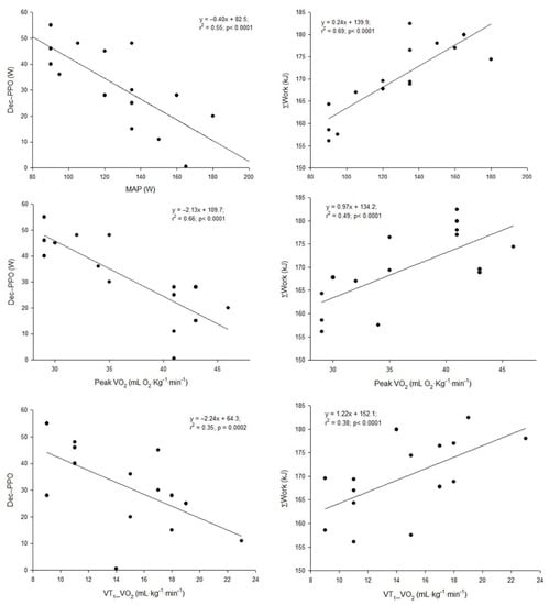 Analysis considering the separate groups did not show any correlation between the performance parameters in the upper body RSA protocol and the parameters determined in the incremental test or square-wave transitions, neither in the JT group nor in the UT group. However, considering the heterogeneous group consisting of the whole sample of participants, significant correlations were found between MAP, peak VO2 and VT1_VO2 and Dec-PPO or ΣWork (Figure 1).
