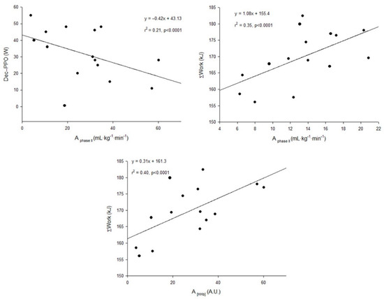 Additionally, for the UT, a significant correlation was found between Aphase II and Dec-PPO or ΣWork and between A [HHb] and ΣWork, as highlighted in Figure 2.