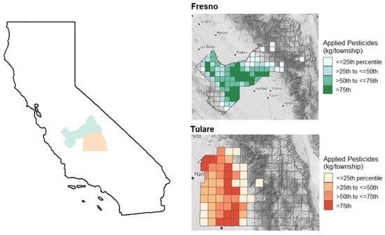 California leads the U.S. in agricultural pesticide use, accounting for nearly 20% of total pesticides applied in the U.S. [15]. In 2018, a total of 95 million kg of applied active ingredients were used in California, treating 427,000 cumulative km2 [16]. The state began reporting agricultural pesticide use in 1990 with the Pesticide Use Report (PUR), which is considered the most comprehensive program of its kind in the world [16]. The PUR includes self-reporting by applicators of date, location, type, amount of pesticides applied, crop types, and planted acres, plus several other items [16]. Although data are intended to be available annually to represent the previous year’s data, there is a multi-year lag, an important limitation for the PUR to be used as an exposure assessment tool.