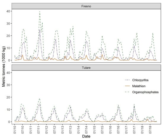 Annual agricultural application (in metric tonnes) by month of total organophosphates in study counties, 2010–2018.