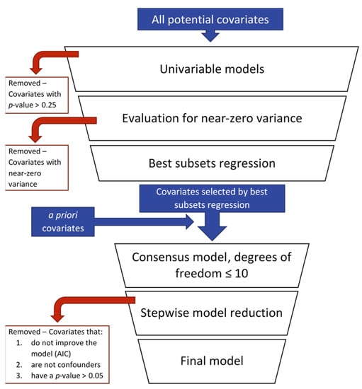 Finally, the consensus model was further reduced in a stepwise manner in which the variable with the highest p-value was eliminated. If the Akaike Information Criterion (AIC) of the reduced model was not smaller than the previous and/or if there was confounding by the eliminated variable, as evidenced by a >20% change in beta estimate of other covariates, the eliminated variable was kept in the model. This was repeated until all covariates in the model were identified as confounders, improved model AIC, or were significantly contributing to the model (p < 0.05).