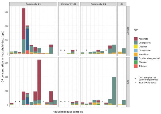 For each individual OP analyzed, Kruskal–Wallis tests were performed to test for statistically significant differences in household dust OP concentrations across the four agricultural communities that were sampled (Supplementary Table S3). These tests revealed that acephate, chlorpyrifos, dimethoate, malathion, tribufos, and total OPs levels in household dust samples did differ significantly between communities. Significant differences were not observed, however, for bensulide (not detected), diazinon, dibrom (not detected), oxydemeton-methyl, phorate (not detected), or phosmet.