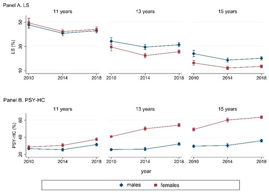 Prevalence (% (95%CI)) of LS (Panel A) and PSY-HC (Panel B), stratified by gender and age groups. Abbreviations: LS: life satisfaction ≥9; PSY-HC: ≥2 psychological health complaints more than once a week.