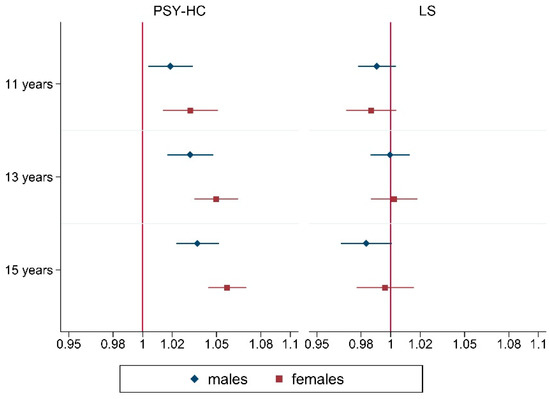 The increasing prevalence of HCs referred mainly to PSY-HC, in all age and gender groups: as represented in Figure 2, respectively, in 11-, 13-, and 15-year olds a mean significant growth of 2% (OR: 1.02; 95%CI: 1.00–1.03), 3% (OR: 1.03; 95%CI: 1.02–1.05) and 4% (OR: 1.04; 95%CI: 1.02–1.05) per year was seen from 2010 to 2018 among boys, while a mean raise of 3% (OR: 1.03; 95%CI: 1.01–1.05), 5% (OR: 1.05; 95%CI: 1.04–1.07) and 6% (OR: 1.06; 95%CI: 1.05–1.07) was observed among girls. In other words, among 11–15 years old girls, respectively, a 26% (OR: 1.26; 95%CI: 1.11–1.44)–56% (OR: 1.56; 95%CI: 1.42–1.72) mean raise of PSY-HC was registered in 2018, compared to 2010, more than among boys, with a mean growth of 13% (OR: 1.13; 95%CI: 1.02–1.25)–33% (OR: 1.33; 95%CI: 1.20–1.48).