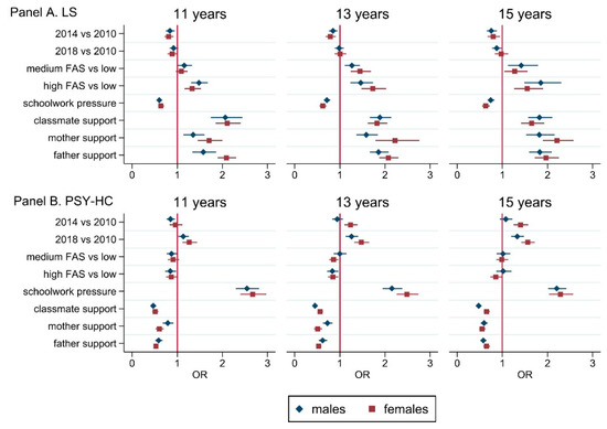 Multivariable regression analysis (OR (95%CI)) performed on LS (Panel A) and PSY-HC (Panel B), stratified by gender and age groups. Abbreviations. LS: life satisfaction ≥ 9; PSY-HC: ≥2 psychological health complaints more than once a week. Adjustment variables: survey year, family affluence scale, schoolwork pressure, classmate support, mother support, father support, family structure, immigration background, geographic area.