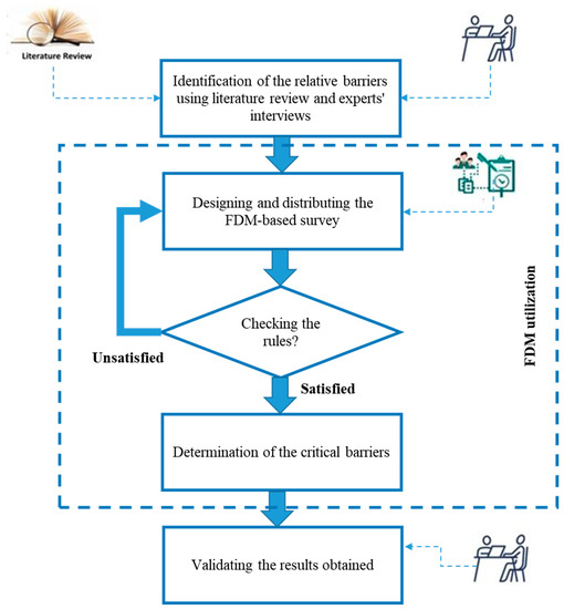 The literature consists of many studies that have adopted the Delphi method in order to elicit, refine, and draw upon the collective opinions of a number of experts about a specific subject []. Many scholars use this method with the aim of alleviating the adverse impacts of group interactions and providing equal opportunities to all people participating in a study to share their viewpoints and take part in decision making processes []. The Delphi method collects all participating experts’ opinions using anonymous questionnaires; afterwards, when the answers are exposed to statistical analyses, the final results are fed back to the experts to be modified again if required. Finally, researchers who make use of this method expect to obtain convergence in the experts’ opinions []. On the other hand, several studies have mentioned that the drawback of the traditional Delphi method is the low convergence of the experts’ opinions, as well as the inefficient process of the method when it is taken into action. This is because iterative inquiries are needed to achieve consensus in the experts’ opinions []. Furthermore, in the Delphi approach, the participants express their opinions in a verbal manner. This is a challenge, given the fact that verbal expression cannot fully reflect an individual’s real thinking styles and it often fails to show their mental latencies. Therefore, a fuzzy set theory (FST) was proposed with the aim of effectively addressing the issues in relation to the subjectivity, ambiguity, and fuzziness of people’s judgments. FST was able to quantify the linguistic facets of the available data and the preferences for group or individual decision-making sessions []. FST is, in fact, a developed version of the traditional set theory, where the elements of a set possess the membership grades ranging between 0 (non-membership) to 1 (full membership) []. With this in mind, the following steps were involved in the execution of the FDM for ranking the identified barriers and determining those considered most critical.