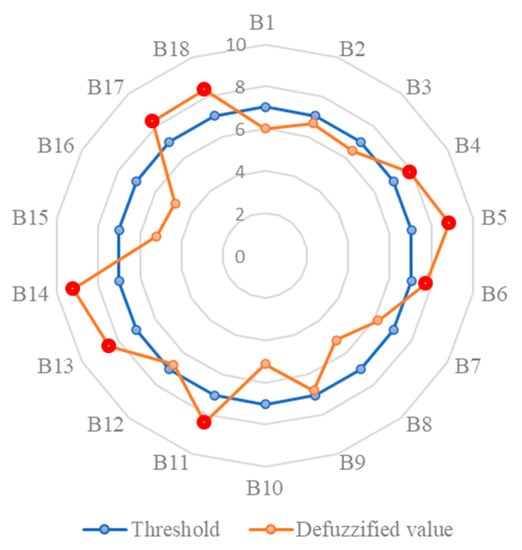 where stands for the defuzzified number of the aggregated responses for barrier , and signifies the threshold value. If the defuzzuifed value of a particular barrier exceeds the specified threshold value, then the barrier will be chosen as a critical one; otherwise, it will be considered non-critical. Notably, for the sake of prioritization, the higher the final weights of barriers (which is denoted as ), the more critical the respective barrier.