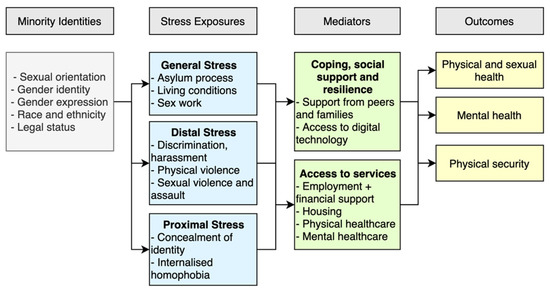 - Golembe, J.; Leyendecker, B.; Maalej, N.; Gundlach, A.; Busch, J. Experiences of minority stress and mental health burdens of newly arrived lgbtq* refugees in germany. Sex. Res. Soc. Policy A J. NSRC 2020. Available online: http://ovidsp.ovid.com/ovidweb.cgi?T=JS&PAGE=reference&D=psyc17&NEWS=N&AN=2020-87750-001 (accessed on 31 October 2021).