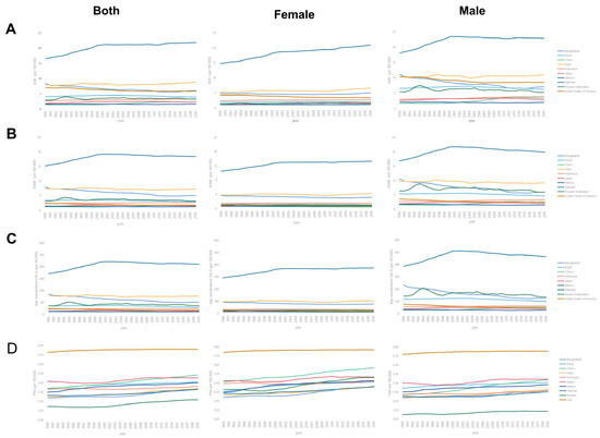 DALY has increased in all countries in the past 30 years, with the fastest growth observed in China (158.62%) and the slowest growth in the United States (20.43%). The 10 countries with the highest DALY in 2019 were India (1,922,663.79), Pakistan (594,088.79) and China (575,805.4), whereas Mexico (27,215.25), Japan (77,039.22) and India (113,143.08) had the lowest DALY. The countries with the highest ASR of DALY were Pakistan (421.87), India (154.9) and Bangladesh (103.95), whereas the countries with the lowest ASR of DALY were Mexico (22.56), Japan (27.73) and China (28.27). The DALY of China, Indonesia and Pakistan increased; those of the United States, Brazil, Russia, Bangladesh, Mexico and India decreased; and that of Japan remained stable. The largest increase in DALY was observed in China, with an EAPC of 1.24 (from 0.96 to 1.52, 95% CI), whereas the largest decrease was in Bangladesh, with an EAPC of −1.81 (from −1.93 to −1.68, 95% CI) (Table 3, Table S3, Figure S1C).