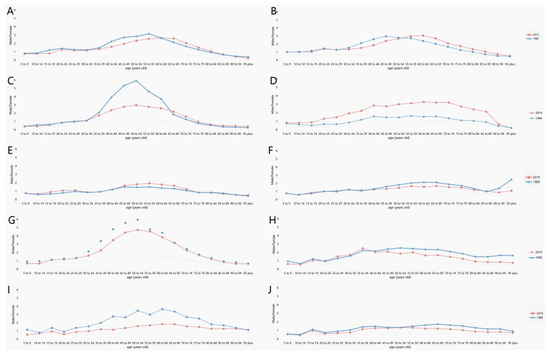 The ratio of male to female incidence of OC among different age groups in 1990 and 2019. (A) Japan, (B) USA, (C) Russian, (D) China, (E) Indonesia, (F) Mexico, (G) Brazil, (H) India, (I) Bangladesh, (J) Pakistan. (Countries are ranked from highest to lowest in SDI.)