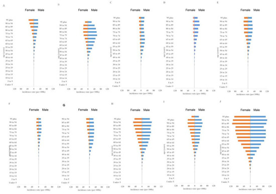 The incidence rates of OC in different age groups in 2019. (A) Japan, (B) USA, (C) Russian, (D) China, (E) Indonesia, (F) Mexico, (G) Brazil, (H) India, (I) Bangladesh, (J) Pakistan. (Countries are ranked from highest to lowest in SDI.).