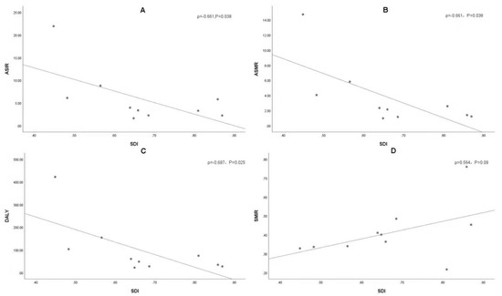 Age-standardised DALY and SDI in 2019 were found to be negatively correlated (ρ = −0.697, p = 0.025) (Figure 4C). In addition, no significant correlation was found between SMIR and SDI in 2019 (ρ = 0.564, p = 0.09) (Figure 4D).