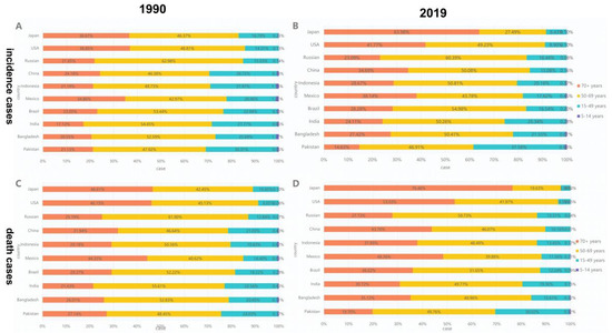 The ASMR and SDI in 2019 were found to be significantly correlated (ρ = −0.661, p = 0.038) (Figure 4B). From 1990 to 2019, the death toll among people aged 70+ years in the United States, Mexico, Japan, Indonesia, India, China, Brazil and Bangladesh increased, whereas the death toll of people aged < 14 years decreased, especially in Japan, where the death toll of people aged 75+ years increased from 46.6% in 1990 to 76.5% in 2019. The death rates in Russia remained stable, whereas the death rate among people aged 70+ years in Pakistan decreased significantly, from 27% in 1990 to 19.7% in 2019 (Figure 5, Figure S5).