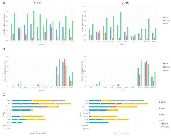 The prevalence of smoking tobacco and chewing tobacco and the consumption of alcohol in ten countries in 1990 and 2019. (A) Smoking tobacco prevalence in 1990 and 2019; (B) Chewing tobacco prevalence in 1990 and 2019; (C) Alcohol, recorded per capita (15+) consumption (in litres of pure alcohol) in 1990 and 2019.