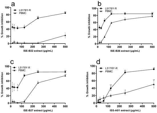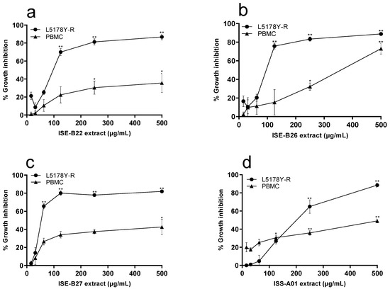 We evaluated the effect of methanol and ethyl acetate extracts from isolated bacteria at concentrations ranging from 15.62 µg/mL to 500 µg/mL on L5178Y-R and human PBMC viability. We showed that methanol and ethyl acetate bacterial extracts inhibited L5178Y-R cells growth (Figure 2 and Figure 3). The endophyte ISE-B27 and the rhizosphere ISS-A16 strain methanol extracts caused the lowest IC50 at 60.03 μg/mL and 34.41 µg/mL, respectively, whereas the endophyte ISE-B26 and the rhizosphere isolate ISS-A16 ethyl acetate extracts induced the lowest IC50 at 26 µg/mL and 4.77 µg/mL, respectively (Figure 2). Ethyl acetate extracts from ISS-A16 and ISE-B26 bacteria presented the highest percentage of inhibition with 89.18% (p < 0.01) and 84.32% (p < 0.01), respectively, at 125 µg/mL (Figure 3). Based on the IC50, we observed SIs from 1.5 to 19.1 for the methanol extracts and from 4.1 to 14.5 for the ethyl acetate extracts, using PBMC as normal control cells (Table 2).