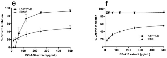 Tumor cell growth inhibition by methanol extracts from I. sonorae endophytic and rhizosphere bacteria cultures. L5178Y-R cells were placed at a concentration of 1 × 104 cells/well and PBMC at 2 × 105 cells/well, and treated with ethyl acetate bacterial extracts at concentrations ranging from 15.62 µg/mL to 500 µg/mL for 48 h. (a) ISE-B22, (b) ISE-B26, (c) ISE-B27, (d) ISS-A01, (e) ISS-A06, and (f) ISS-A16. Cell growth inhibition was assessed by the MTT reduction assay, measuring ODs at 570 nm. Vincristine (VC) was used as a positive control at a concentration of 0.05 µg/mL, as detailed in the text. VC caused 69.98% and 16% growth inhibition against L5178Y-R and PBMC, respectively. Data represent mean ± SD of triplicates from three independent experiments. * p < 0.05; ** p < 0.01, as compared with untreated control.