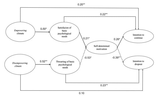 This study intends to identify the mediating mechanisms in the relationship between the players’ perception of the empowering and disempowering climate created by the coach, and the intention of young soccer players to continue/drop out of the sport practice. Concretely, we tested the mediator role of satisfaction/frustration of basic psychological needs and self-determined motivation in the aforementioned relationships. To date, we do not know of any other study that includes all the variables of Duda’s [] model that we introduce in this work. Therefore, this research empirically contributes to testing the theoretical propositions formulated in this model [,] to analyze if it provides validity. This work also proposes to offer sports coaches keys to understanding how a climate they create in their sports teams (empowering/disempowering) can favor the future intention to continue participating in the sport or increase the intention to drop out of sports participation, as well as the psychological mechanisms that contribute to this intention.