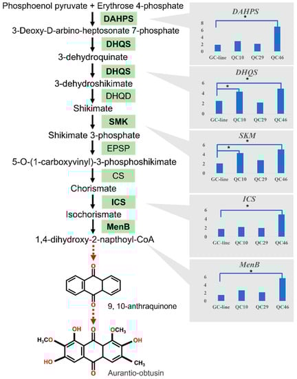 3.7. DEGs Involved in Anthraquinone Biosynthesis Pathway