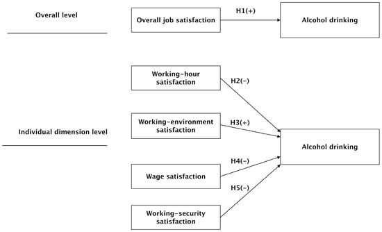 Overall job satisfaction and its relationship with alcohol consumption are complex and not fully understood. Job satisfaction is the degree to which a person is satisfied with a number of different features of the job, and overall job satisfaction is the sum of separate satisfaction items derived from different job factors regarding rate of pay, hours of work, job security, physical working conditions, and industrial relations [,]. According to Western research, those who have a negative attitude towards their work are also generally alcohol-prone because they are seeking solace in alcohol [,]. However, little attention is paid to the relationship between overall job satisfaction and alcohol consumption. Researchers in China currently generally agree that lower levels of satisfaction with life and work are primarily associated with alcohol abuse and alcoholism []. In Chinese cultural patterns, drinking is a part of social practice, and social interaction plays the most important role in all drinking factors [,]. Features of overall job satisfaction provide social space–time conditions for social drinking. Chinese people who are overall satisfied with their work are more likely to enjoy life and leisure through social drinking []. Therefore, the alcohol consumption of people who are satisfied with their job may be higher than that of people who are dissatisfied with their job. Therefore, the following hypothesis is proposed: