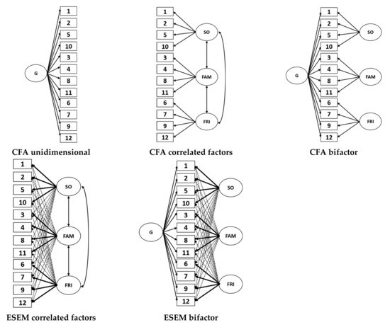 Representation of the CFA and ESEM models tested. G: General factor; SO: Others support factor; FAM: Family support factor; FRI: Friends’ support factor.