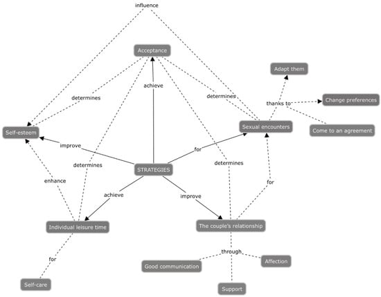 Faced with the physical, emotional, and vital changes characteristic of the postpartum period, women look for alternatives or strategies to improve their sexual satisfaction during the first six months after childbirth and manage the new situation. Through the process of analyzing the collected material, 17 codes were identified and grouped into 3 categories. One of the categories was divided into two subcategories, formed by 11 of the 17 codes (Table 4). A total of 334 units of meaning related to the strategies used by women to cover physical, emotional, and vital changes affecting sexuality were obtained.