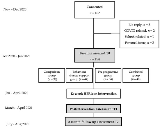 - Cowley, E.; Watson, P.; Foweather, L.; Belton, S.; Mansfield, C.; Whitcomb-Khan, G.; Cacciatore, I.; Thompson, A.; Thijssen, D.; Wagenmakers, A. Formative Evaluation of a Home-Based Physical Activity Intervention for Adolescent Girls—The HERizon Project: A Randomised Controlled Trial. Children 2021, 8, 76. [Google Scholar] [CrossRef] [PubMed]