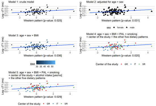 Regression plots of the statistically significant association of the “Western” pattern with Log- cT1 (ms) for the Models 1–5.