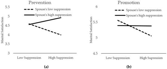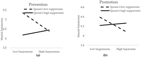 Specifically, prevention-focused individuals aim to escape from negative outcomes and, thus, primarily adopt avoidance strategies [,,]. Since prevention-motivated individuals prefer avoiding negative experiences (i.e., conflicts and disruptions) over obtaining positive experiences (i.e., intimacy and affection) [,], they place more value on maintaining relationship stability than enhancing their relationship when determining satisfaction []. In such situations, emotional suppression is considered a positive avoidance strategy for those with prevention motivation, as the inhibition of emotional behaviors is assumed to be the safest way to maintain the status quo and ensure that nothing goes wrong within the relationship [,]. Thus, it could be predicted that emotional suppression would lead to greater marital satisfaction for prevention-focused individuals.