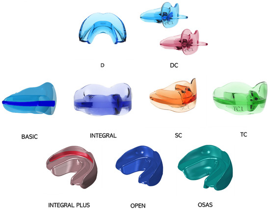 - − ELASTO-OSAS (Figure 1) is designed for the treatment of night snoring, sleep apnea. It features a front sliding plane and an accentuated lingual shield to promote the correct positioning of the tongue on the palate [14,15].