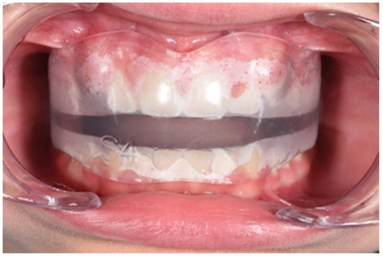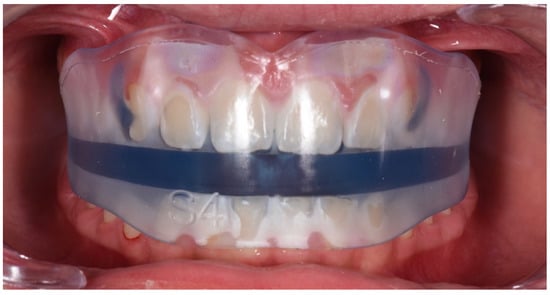 Intraoral photograph of the patient wearing the AMCOP OS.