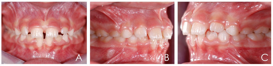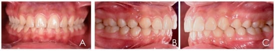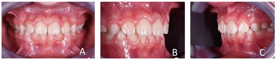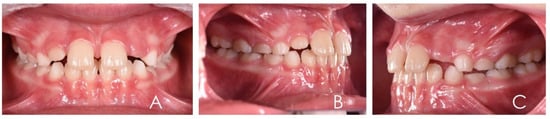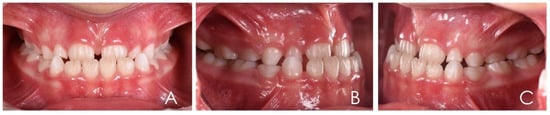Intraoral photographs at the end of the treatment (8-year-old). (A) Frontal view; (B,C) lateral view.