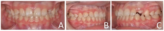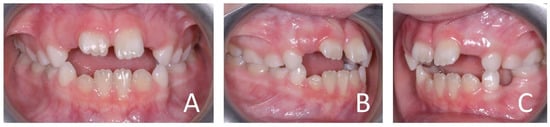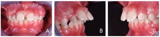 Intraoral photographs of the subject before the treatment (7-year-old). (A) Frontal view; (B,C) lateral view.